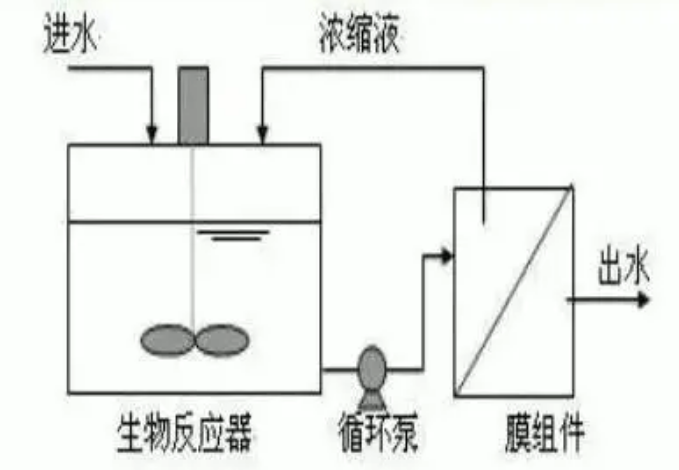 生物反应器中的混合液经循环泵增压后打至膜组件的过滤端,在压力作用下混合液中的液体透过膜,成为系统处理水;固形物、大分子物质等则被膜截留,随浓缩液回流到生物反应器内。