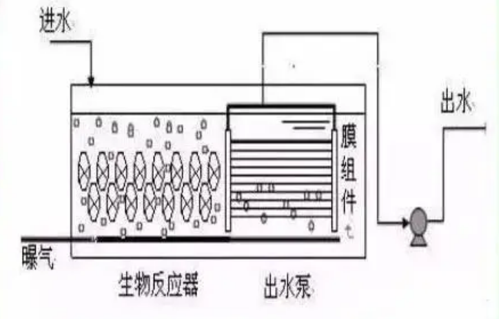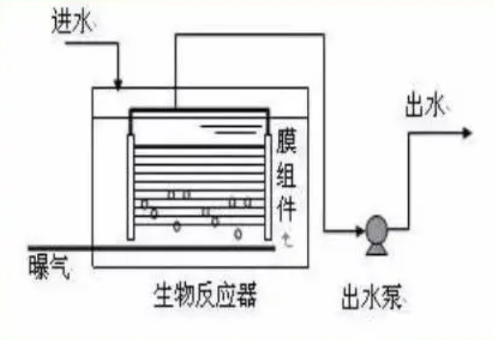 把膜组件置于生物反应器内部。进水进入膜--生物反应器,其中的大部分污染物被混合液中的活性污泥去除,再在外压作用下由膜过滤出水。