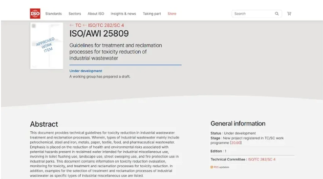 工业水回用领域国际标准《工业废水处理和再生工艺的毒性削减导则》(Guidelines for treatment and reclamation processes for toxicity reduction of industrial wastewater)(标准号:ISO/AWI 25809)由ISO/TC 282/SC 4(国际标准化组织工业水回用分技术委员会)国内技术对口单位——南京大学宜兴环保研究院提交、研究院院长/南京大学任洪强院士团队主导提出。