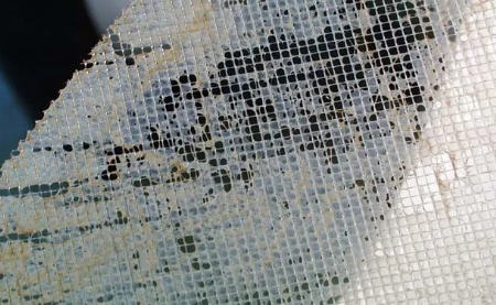 膜元件内进水网格上所黏附的的生物污染层(膜元件解剖后所拍摄的膜表面照片)