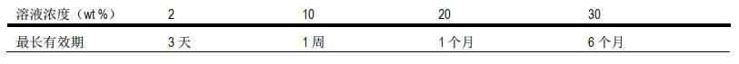 在干燥阴冷的贮存条件下,固体SMBS的有效期为4~6个月,但在水溶液中,亚硫酸氯钠(SBS)会随时与空气中的氧发生氧化还原反应,根据所配制的溶液浓度的不同,溶液的有效期为:
