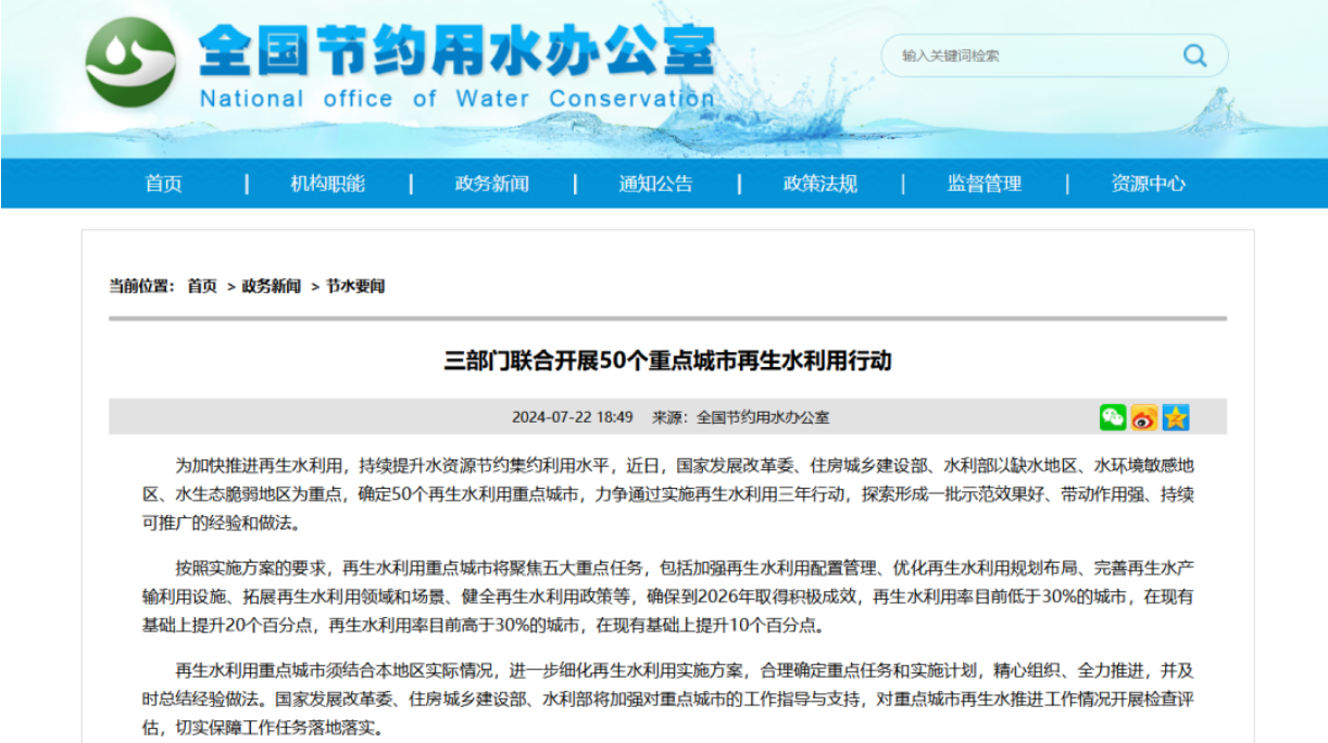 据全国节约用水办公室发文称,为加快推进再生水利用,持续提升水资源节约集约利用水平,近日,国家发展改革委、住房城乡建设部、水利部以缺水地区、水环境敏感地区、水生态脆弱地区为重点,确定50个再生水利用重点城市,力争通过实施再生水利用三年行动,探索形成一批示范效果好、带动作用强、持续可推广的经验和做法。