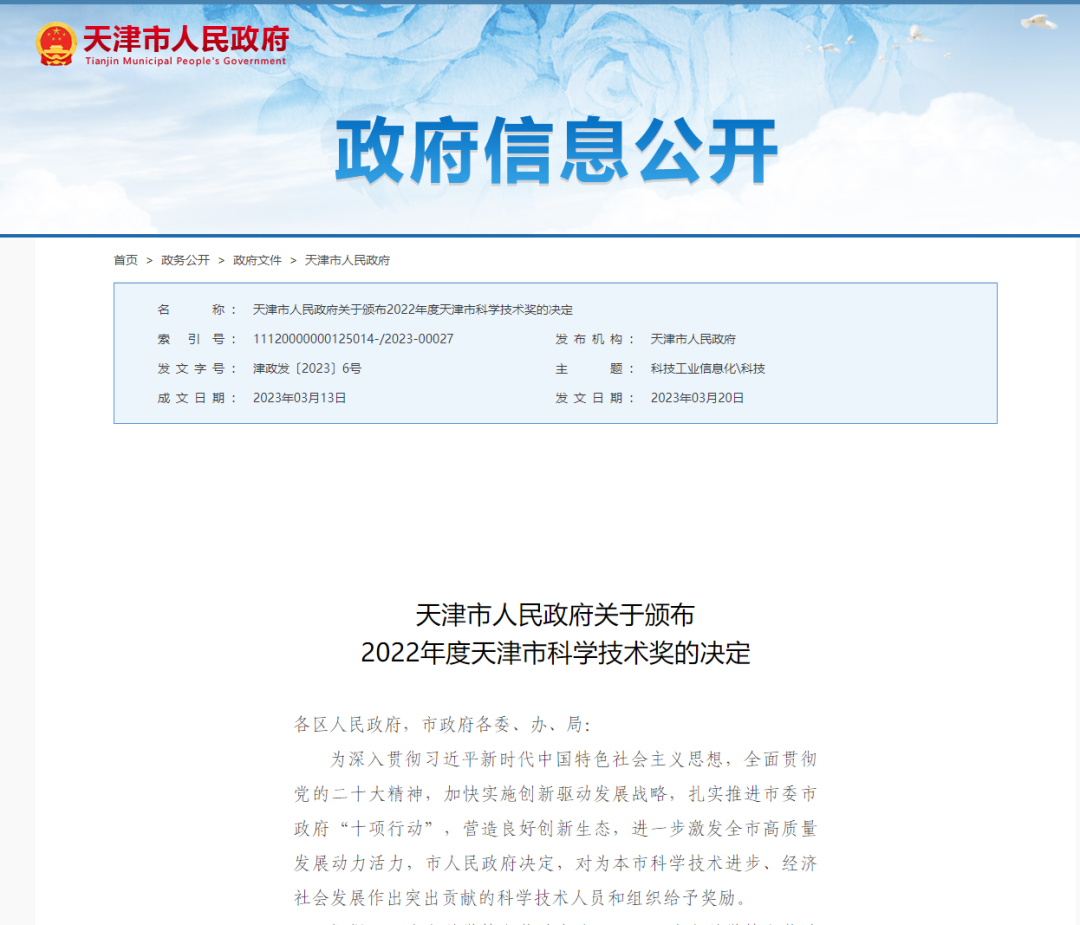 近日,天津市人民政府发布了2022年度天津市科学技术奖评选结果。天津膜天膜科技股份有限公司参与完成的《先进膜材料制备技术及其水环境应用》项目荣获天津市技术发明一等奖。