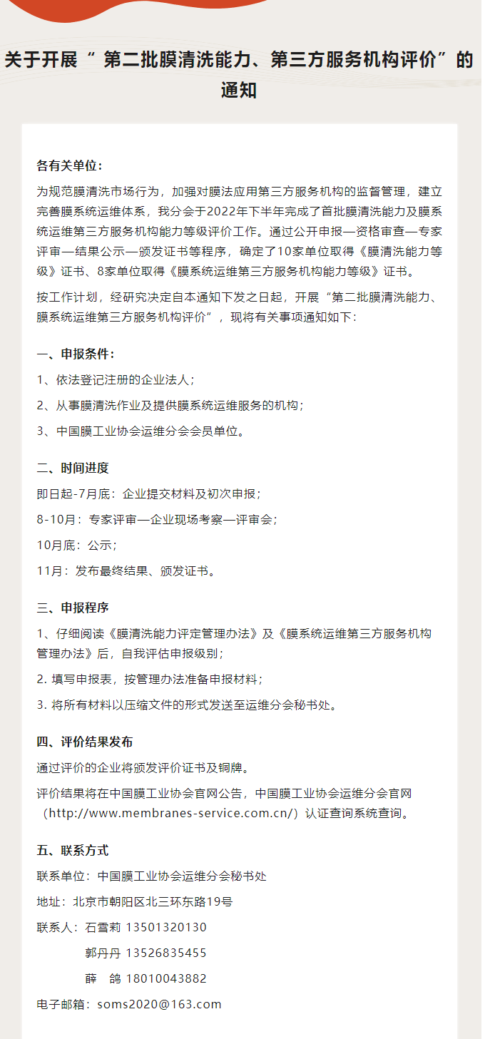 关于开展 “ 第二批膜清洗能力、第三方服务机构(2023)” 的通知