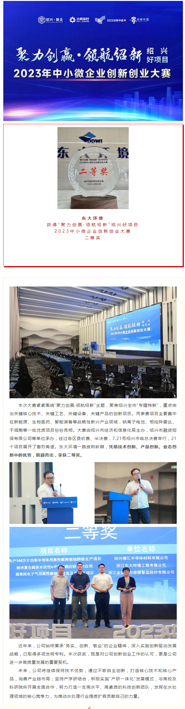 恭喜东大环境获得“聚力创赢·领航绍新”绍兴好项目 2023中小微企业创新创业大赛二等奖