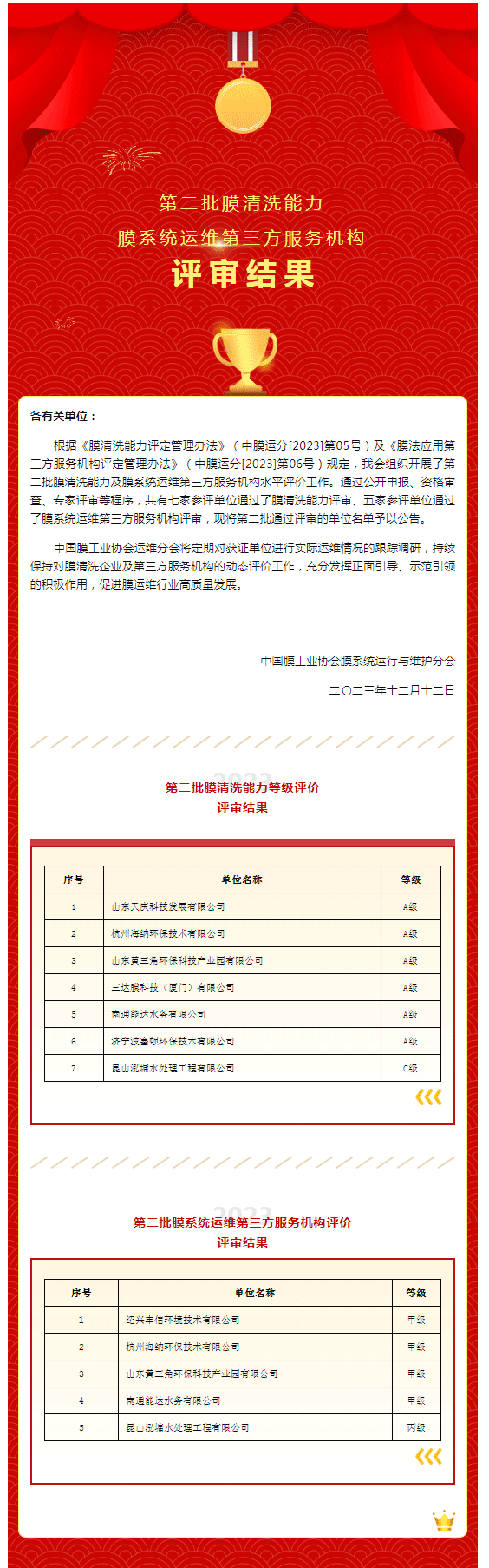 关于第二批膜清洗能力及膜系统运维第三方服务机构评审结果的公告