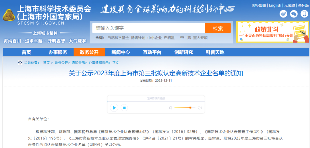 2023年12月11日,上海市高新技术企业认定管理办公室通过“上海市科学技术委员会官方网站”发布了《关于公示2023年度上海市第三批拟认定高新技术企业名单的通知》的公示。