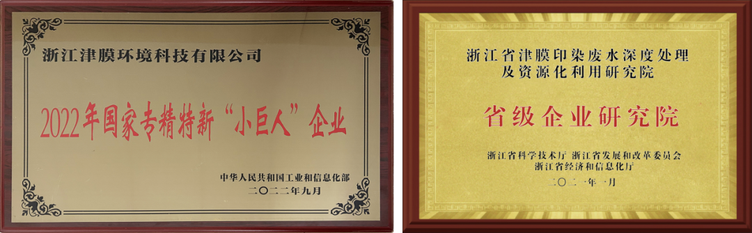 近年来,浙江津膜高度重视科技创新,拥有“津膜绿色印染省级高新技术企业研究开发中心”及“浙江省津膜印染废水深度处理及资源化利用研究院”两个省部级研发平台,2022年获批国家级专精特新“小巨人”企业,2023年作为主编单位编制的国家标准《印染废水膜法集成装备》将于近日颁布实施。该课题的成功获批,将进一步提升公司整体的科技创新水平,赋能企业高质量快速发展。