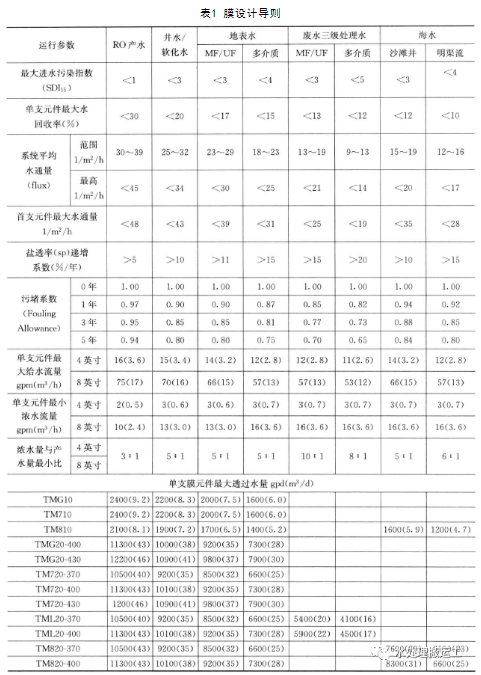 针对选定的膜元件,在RO装置设计时,应严格遵循RO膜的设计导则。表1所列有关参数和运行的数值,是基于膜的性能以及运行经验而确定的,主要包括:进水性质、污染指数SDI15值、平均水通量、最高回收率、最大水通量、最高进水量、最低浓水量等。