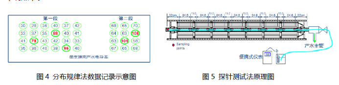 系统一旦出现脱盐率下降问题,可以首先通过分布规律法(图4)和探针测试法(图5)确定受损膜元件;也可以对单支膜元件进行探针测试确定膜元件哪个部位出现泄漏,出现背压损伤的膜元件浓水端的透盐率一般高于进水端的透盐率,或者说产水电导曲线出现明显的上升(跳点)。