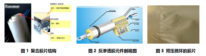 膜的破裂最有可能出现在进水侧、最外侧和浓水侧这三处粘接密封线附近,其它位置受到进水网格的支撑,很多网格的小格内就会出现很多气泡状剥离,使得膜脱盐层受到强烈拉伸,导致膜元件的脱盐率降低。