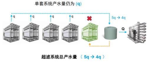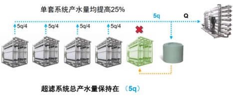 恒通量运行,反洗时总产水量变低,超滤系统下游有产水缓冲箱